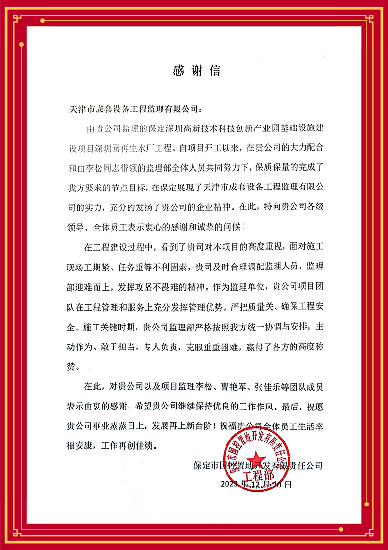 2024年,為持續深化“1264”戰略體系特別是“六化”舉措,加快推進實體化進程,天津咨詢順利完成吸收合并下屬成套監理公司,在持續打造天津咨詢品牌,以工程監理和項目管理為基礎,發揮在項目建設期的綜合專業優勢,逐步形成“監”“管”一體化服務模式方面邁出關鍵一步。近期,多家業主單位先后發來感謝信、表揚信,對天津咨詢承擔工程建設監理任務給予充分肯定。