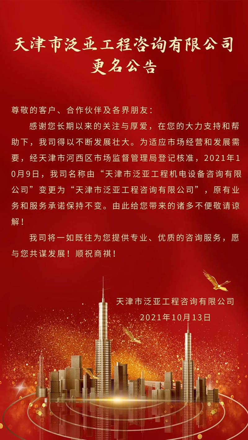 天咨所屬泛亞公司更名為“天津市泛亞工程咨詢有限公司”