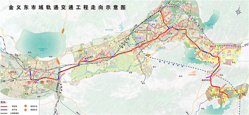 項目建設規模由金華—義烏和義烏—東陽兩條線路組成,兩線在秦塘站呈雙島四線同站臺換乘。其中,金華—義烏線起于金華火車站,沿雙龍街-李漁路-李漁東路-站前路-金義新區新城路-規劃國貿大道二期-國貿大道一期,止于義烏秦塘站;義烏—東陽線起于義烏火車站,沿宗澤路-國貿大道-商城大道-陽光大道-世茂大道-興平路-迎賓大道-S218-鎮北路-萬盛北街-橫店環城東路,止于橫店客運中心。兩條線路總計全長約107.18公里,共設站31座(其中地下站13座,高架站18座),設一段三場,建設地址位于金華地區(含金華市婺城區、金東區、義烏市、東陽市),計劃于2021年建成。